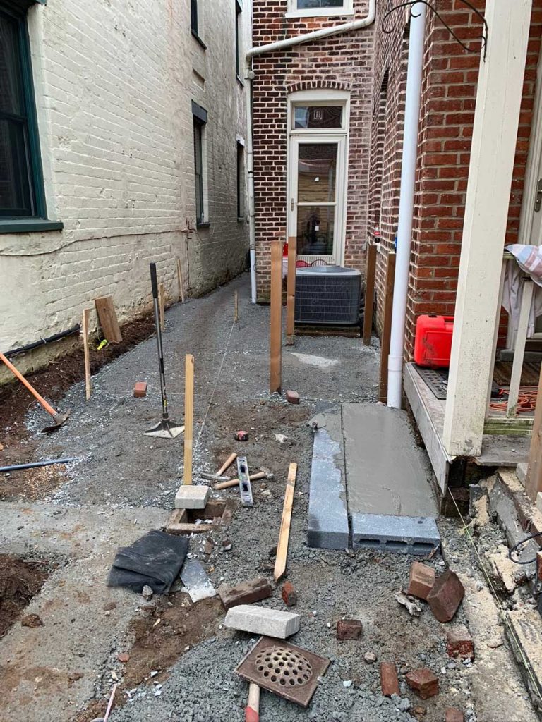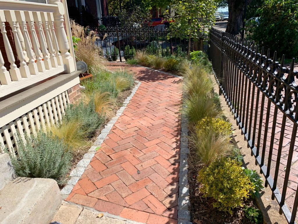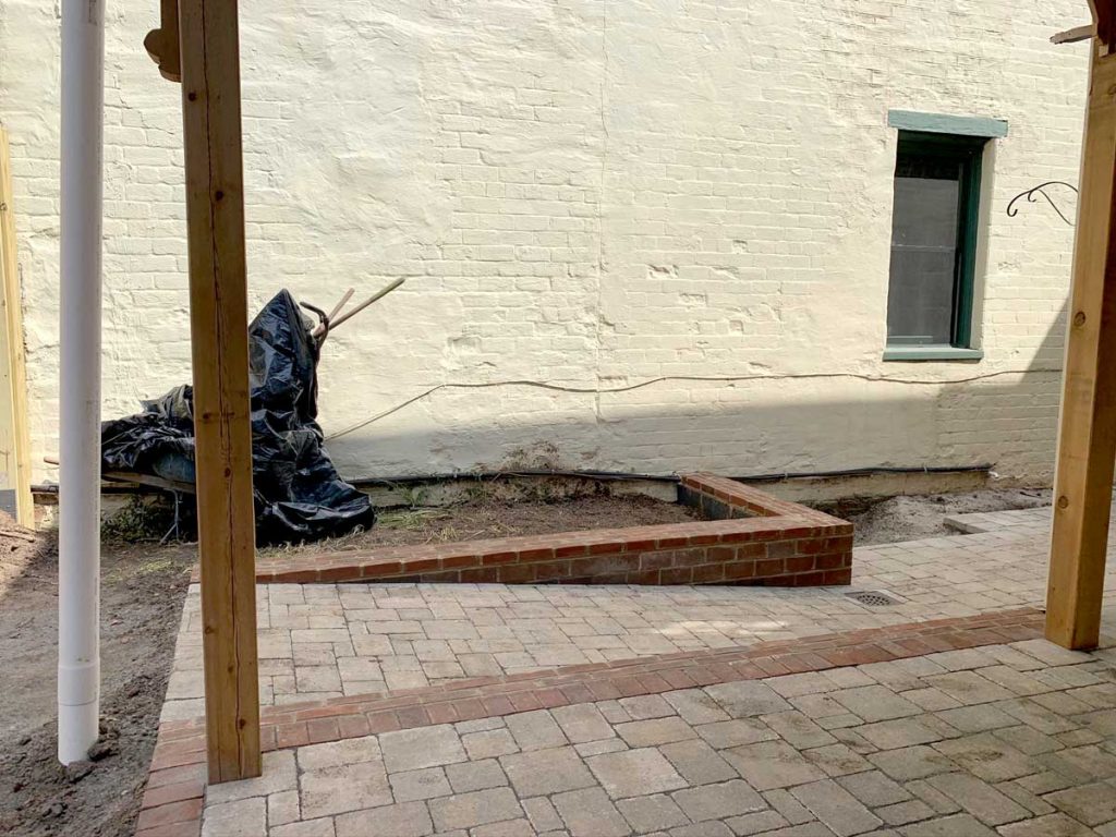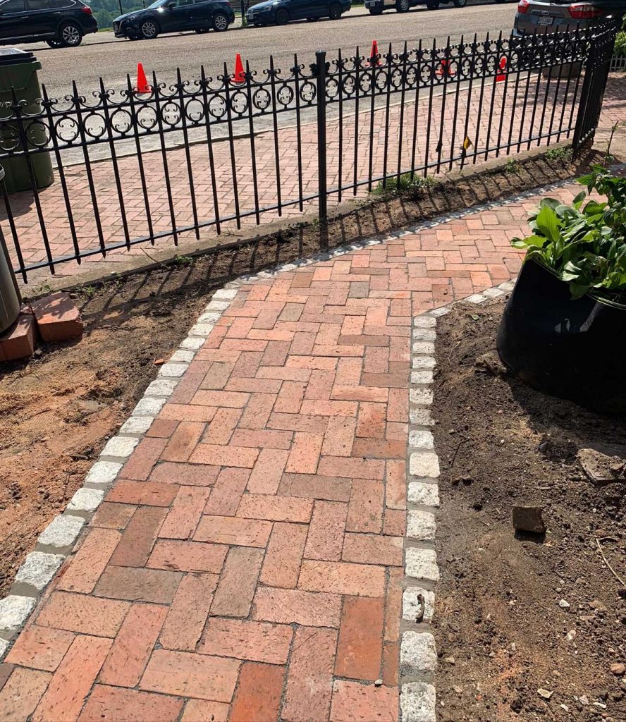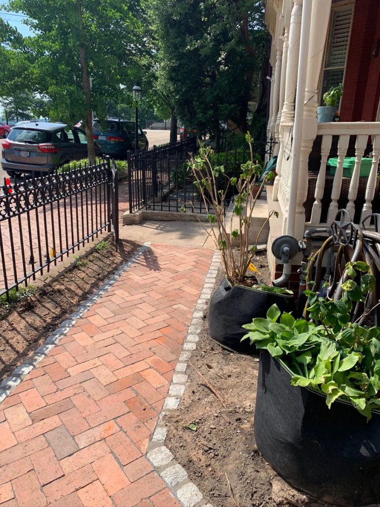 Remember the large stack of bricks that came out of the back yard? The masons reused them and we stuck to the historic guidelines and laid them in a herringbone pattern to match the sidewalk and edged them in granite cobbles to complement the historic granite curbs!