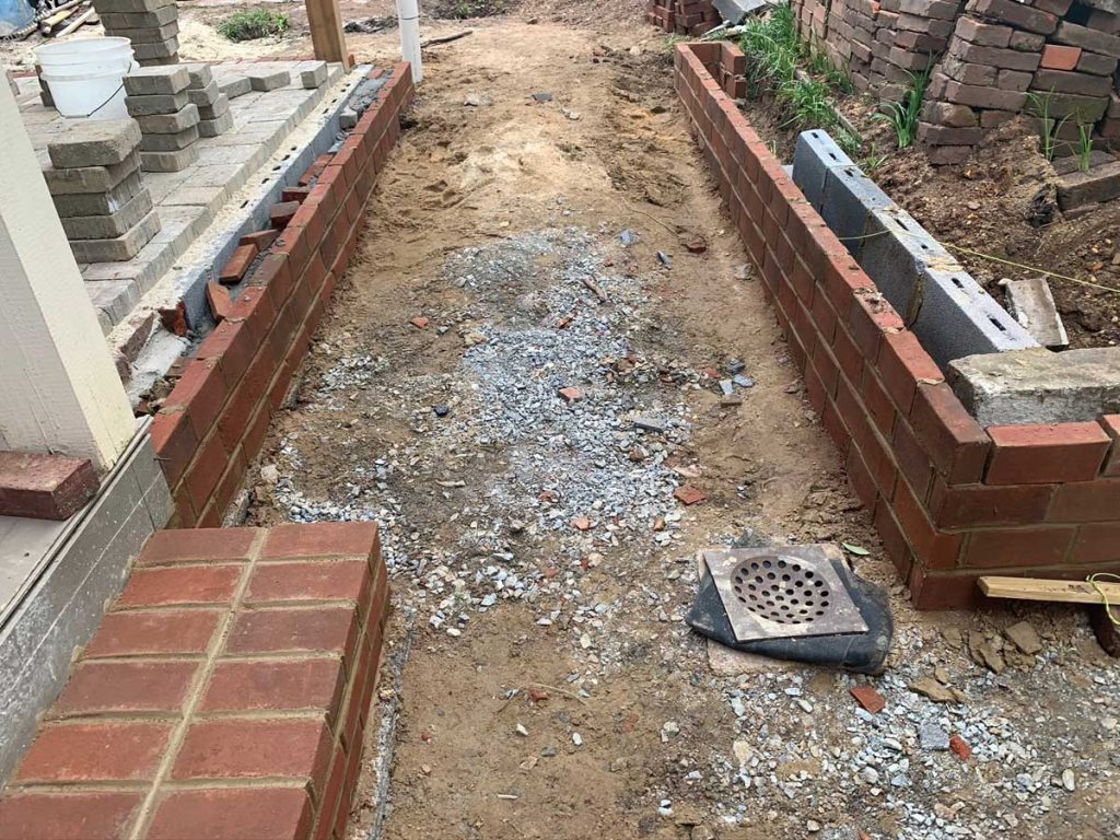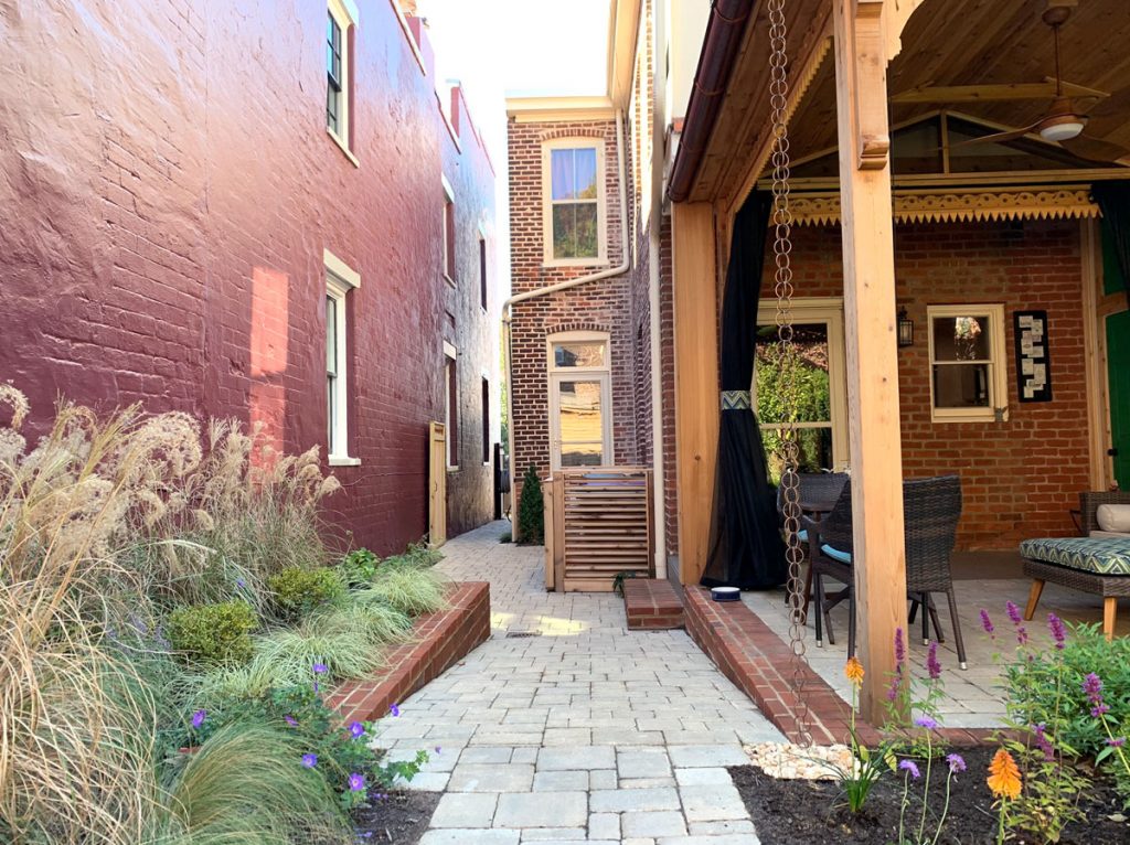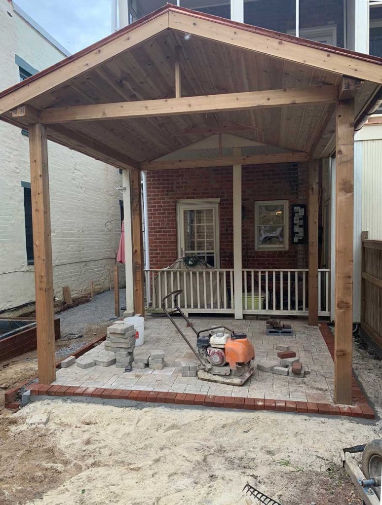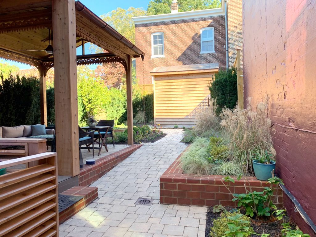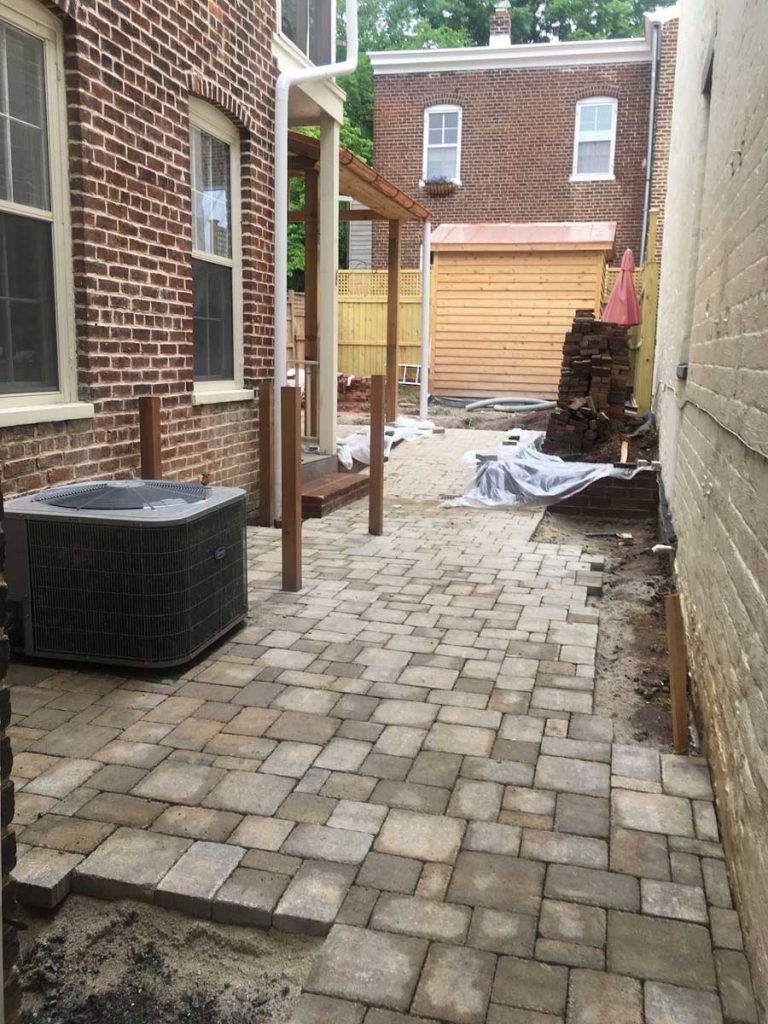 Remember the large stack of bricks that came out of the back yard? The masons reused them and we stuck to the historic guidelines and laid them in a herringbone pattern to match the sidewalk and edged them in granite cobbles to complement the historic granite curbs!