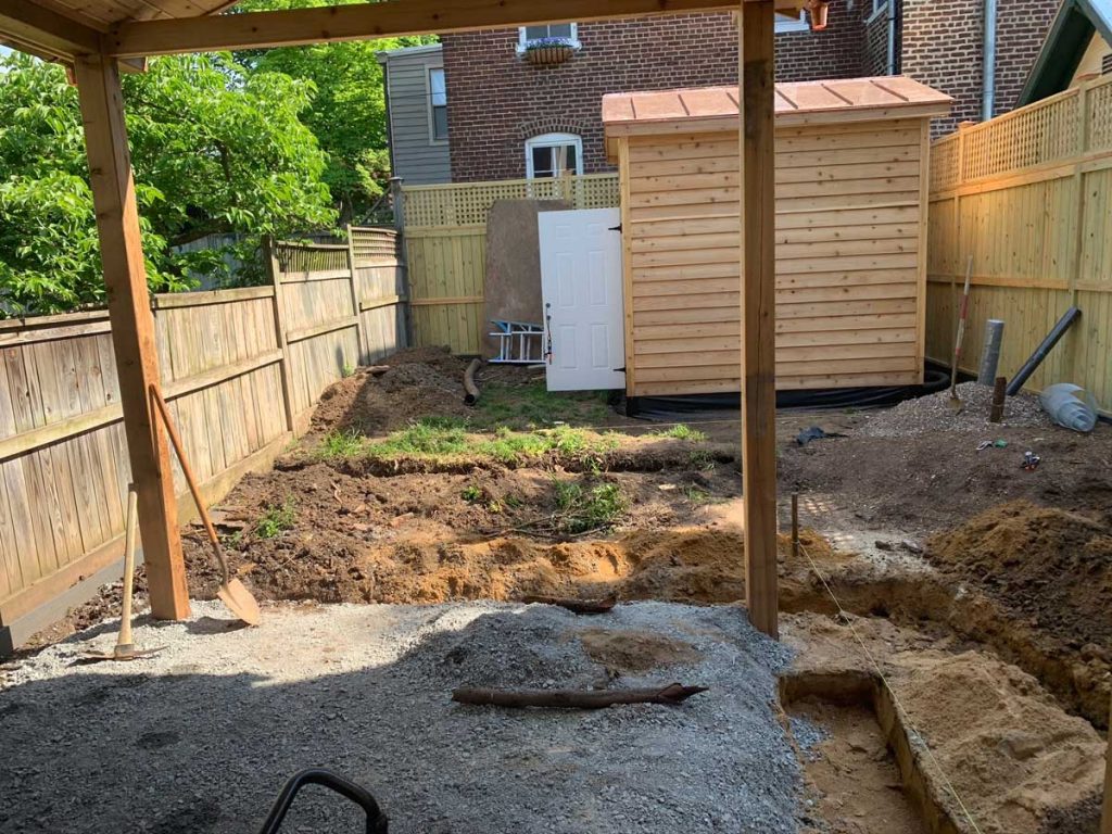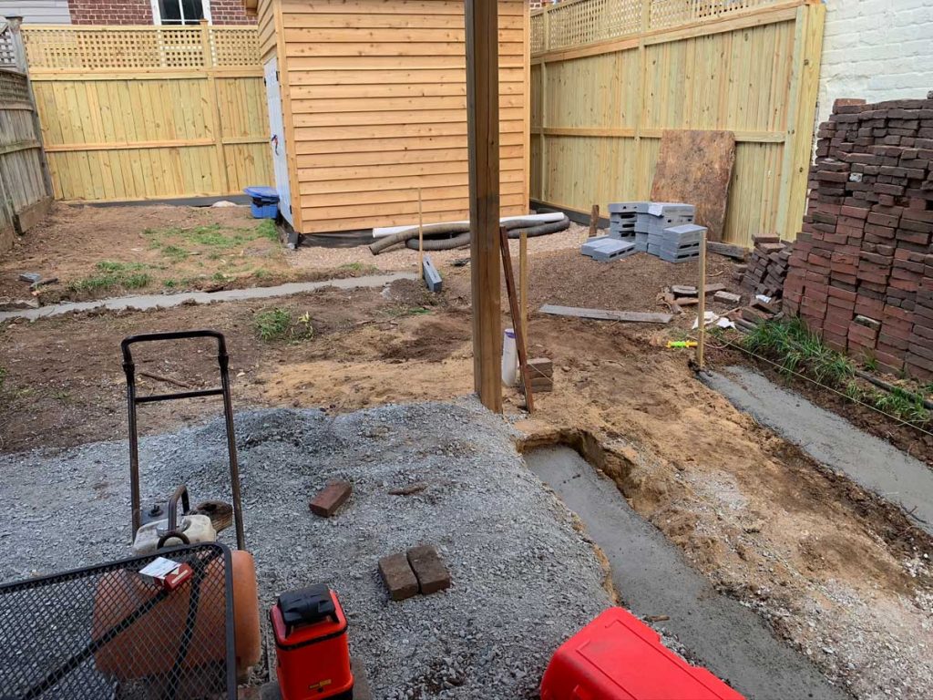 Now that the fence, and two custom structures are in place, the grading of the site can continue and the hardscaping can start!
