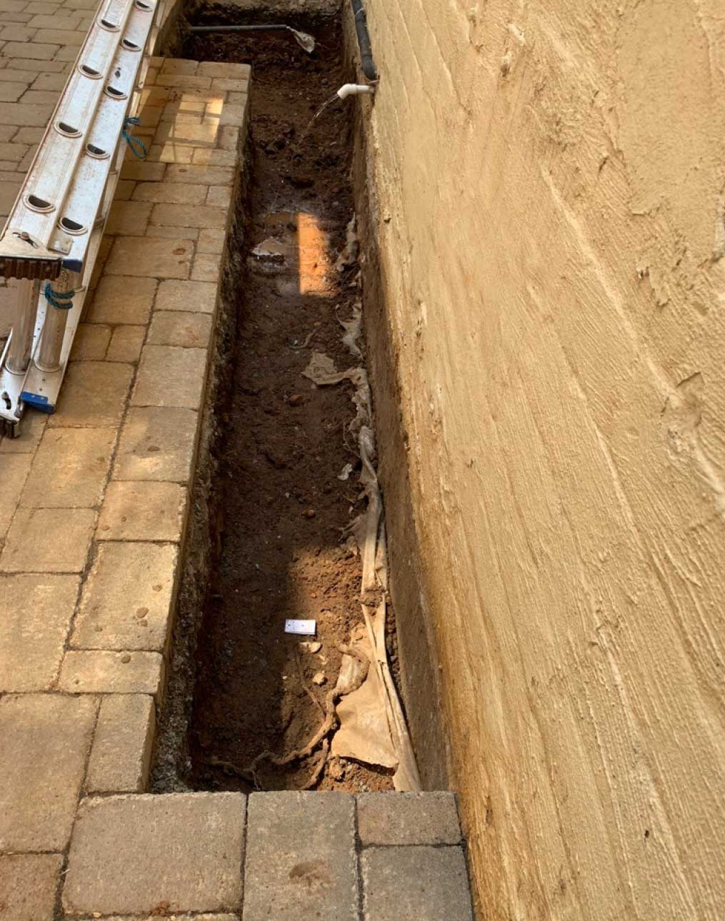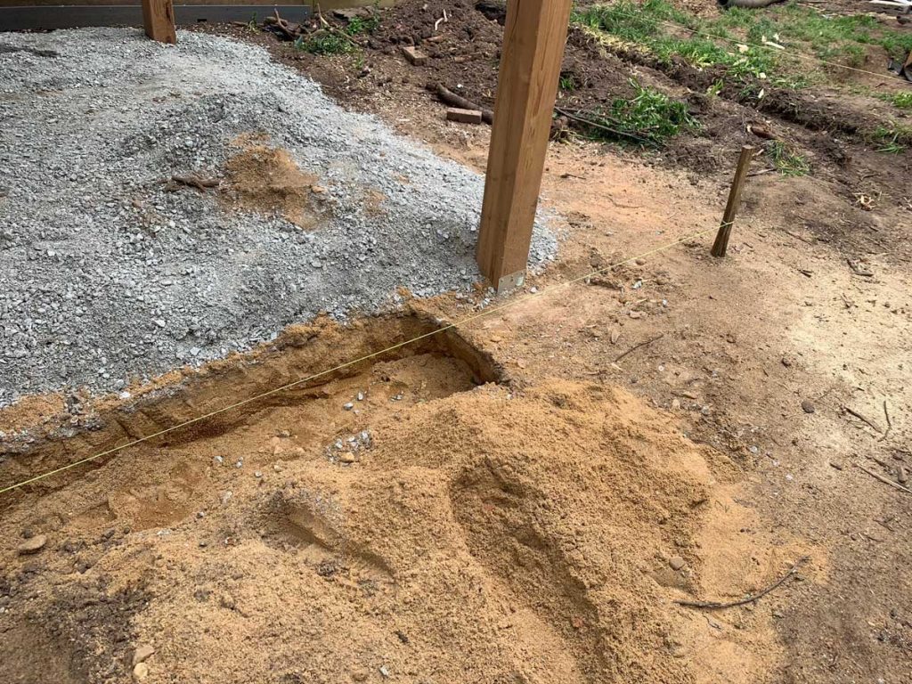 Here you can see the footer dug out for the wall that supports the patio and creates the edge of the ramp.