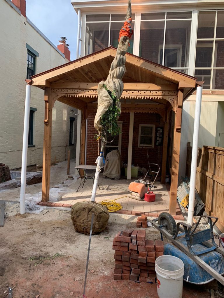 This first one had a monster sized root ball. The tree dolly wouldn’t fit through the gate, so we had to use a regular dolly and three people to manhandle it in place. Always start with the hardest item first, right?