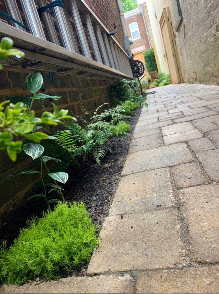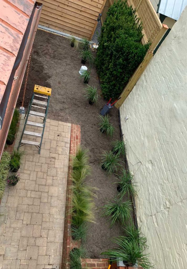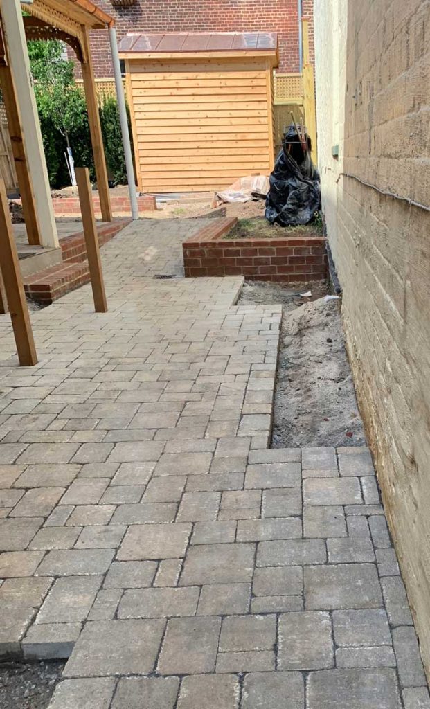 The side lower patio/walkway got installed next. Below we are deciding how to make the garden bed edges look perfectly square, when the neighbours house is not parallel to the clients home. A completely normal issue to have, especially when working with 100+ year old homes.