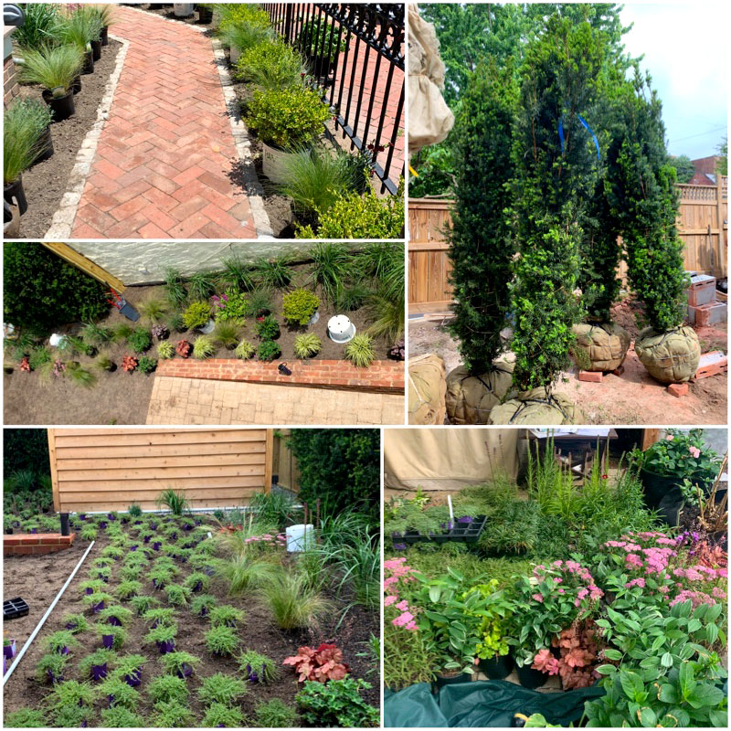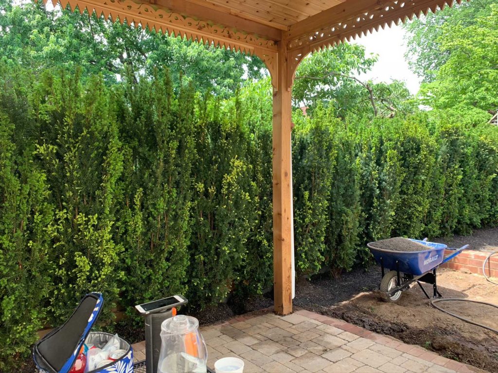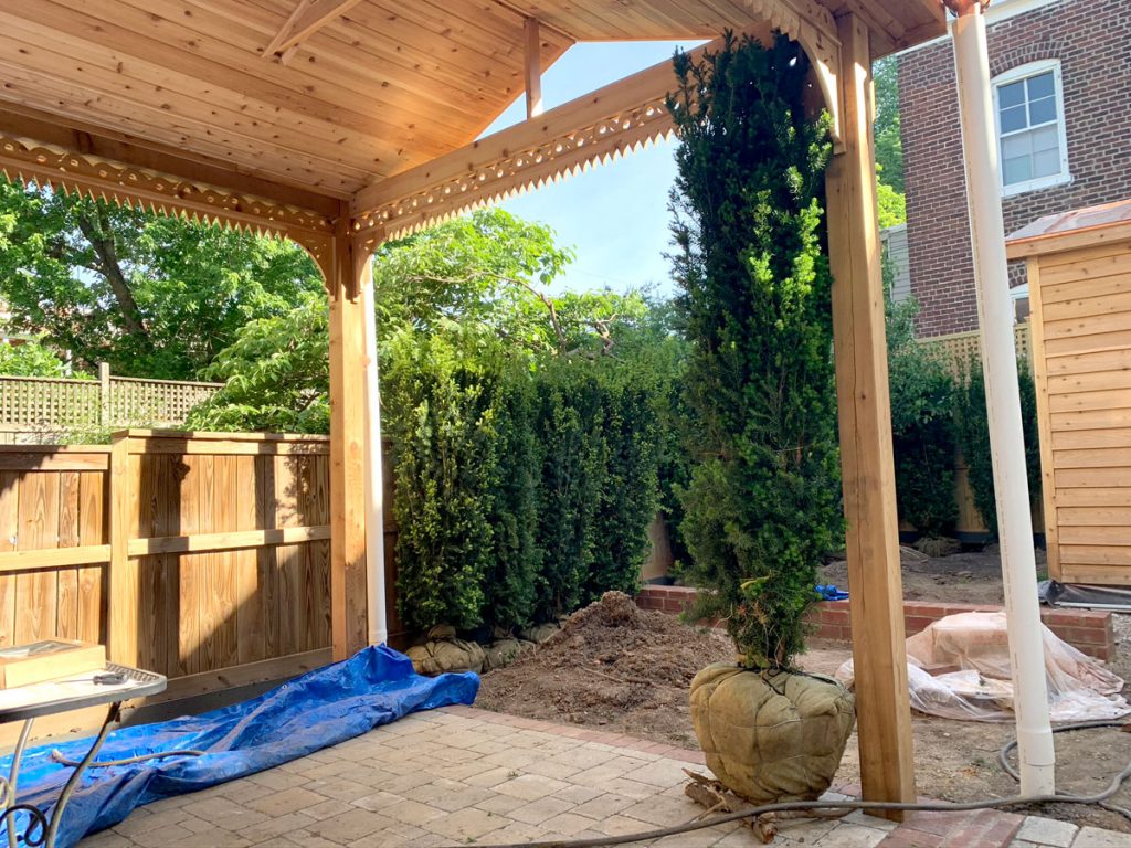 Next we brought in the yew hedging. For context here is ONE beside the pergola. My grower told me they would be 160lbs each. The best guess from my planter is that they were 300 lbs each. Big and Beautiful!