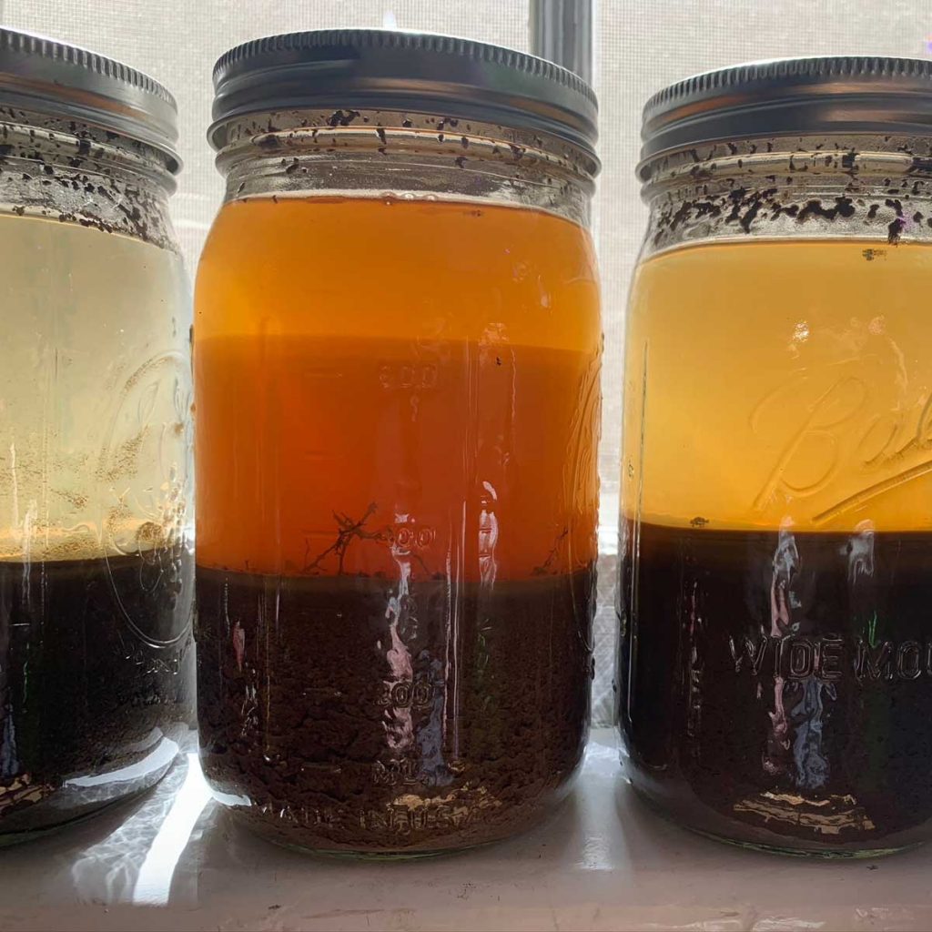 The photo below shows the results from the “Soil Jar Test” from various places in the yard to find out the soil composition of each garden area. The soil separates and lets us see how much sand, silt, clay, loam and organic matter is in each sample. The jar on the far left has the clearest water and the least amount of organic matter. The jar in the middle has the most organic matter and the one on the right had between the other two.