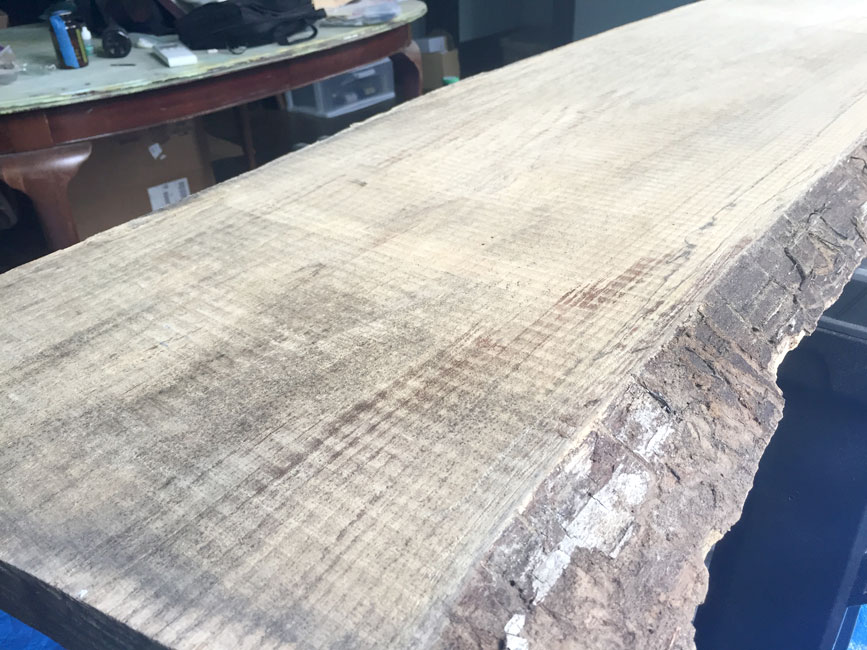 Here is the ash slab that I am making the live edge floating shelves out of for the kitchen sink side of the room. It looks a little rough here, but after lots of sanding they look pretty great!