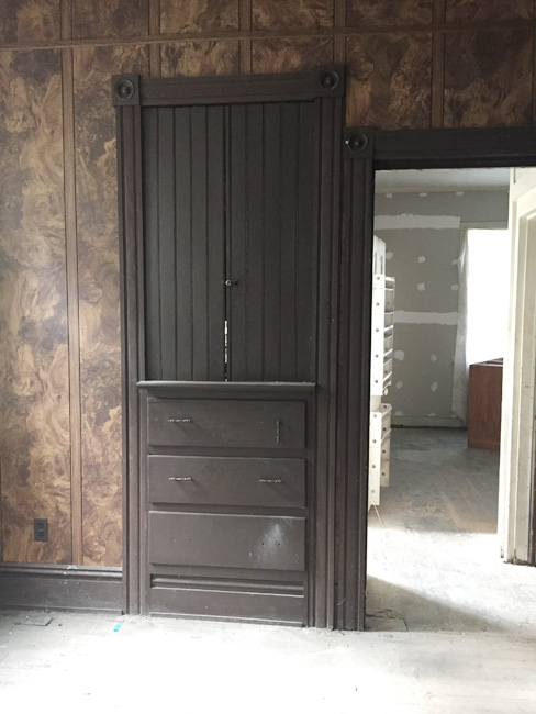 The built in pantry also has a passthrough that goes to the walk-in pantry. The colourful cloth is hiding the square hole because I didn’t want you to be distracted by the mess that is hiding back there! Once the walk in is complete, I’ll open the peekaboo hole up and you’ll be able to see right through.