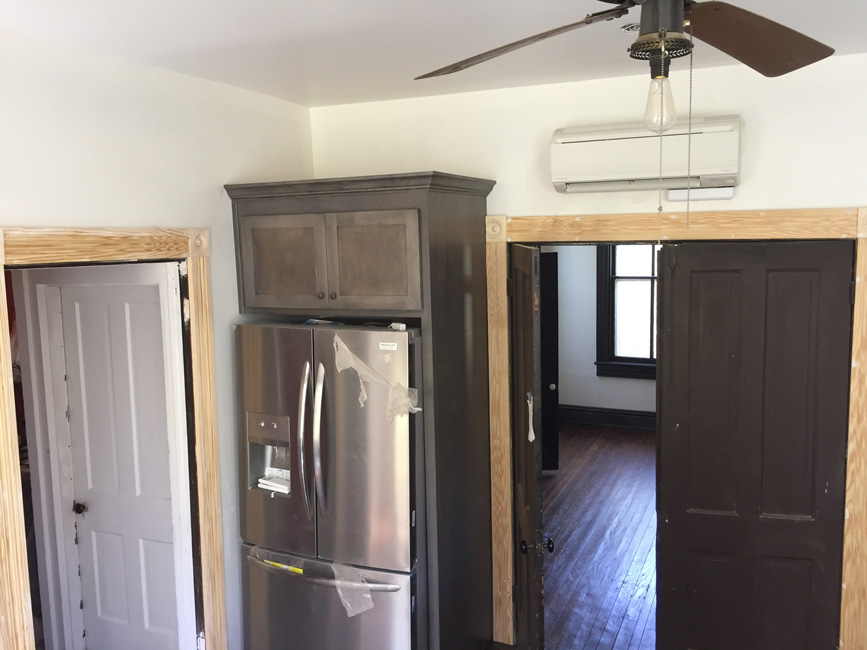 The HVAC was a separate project entirely. This house got a full mini-split system — individual head units in each room, fed by copper line sets running from outdoor condensing units. Installing line sets through a 1911 house means feeding two insulated copper pipes, an electrical wire, and a condensate drain line through walls built with old-growth lumber used as studs — dense, massive, and not interested in cooperating. Eight line sets total, four running through the kitchen walls.