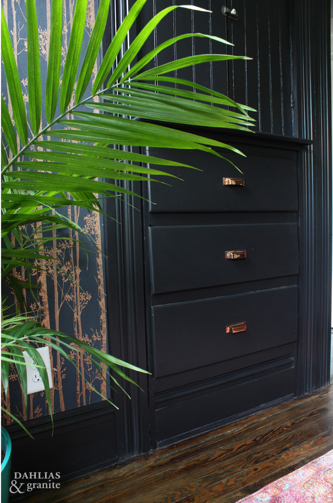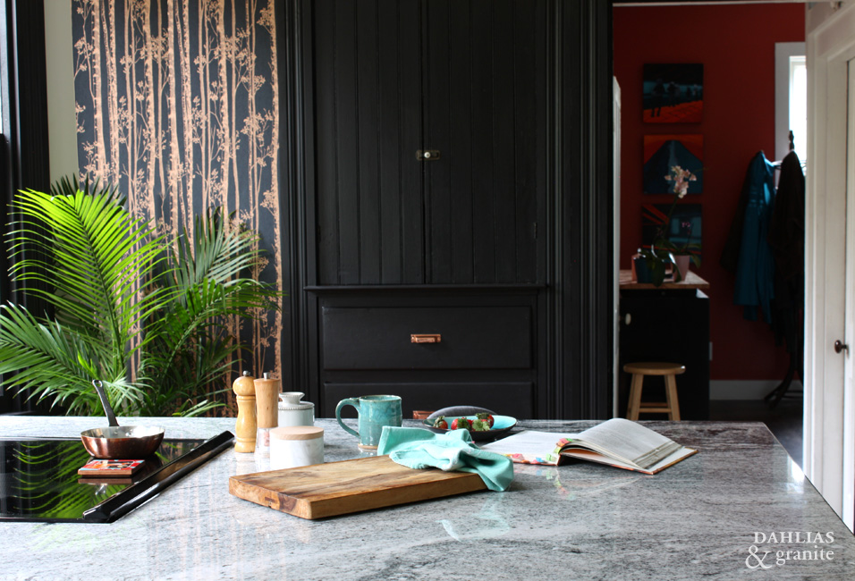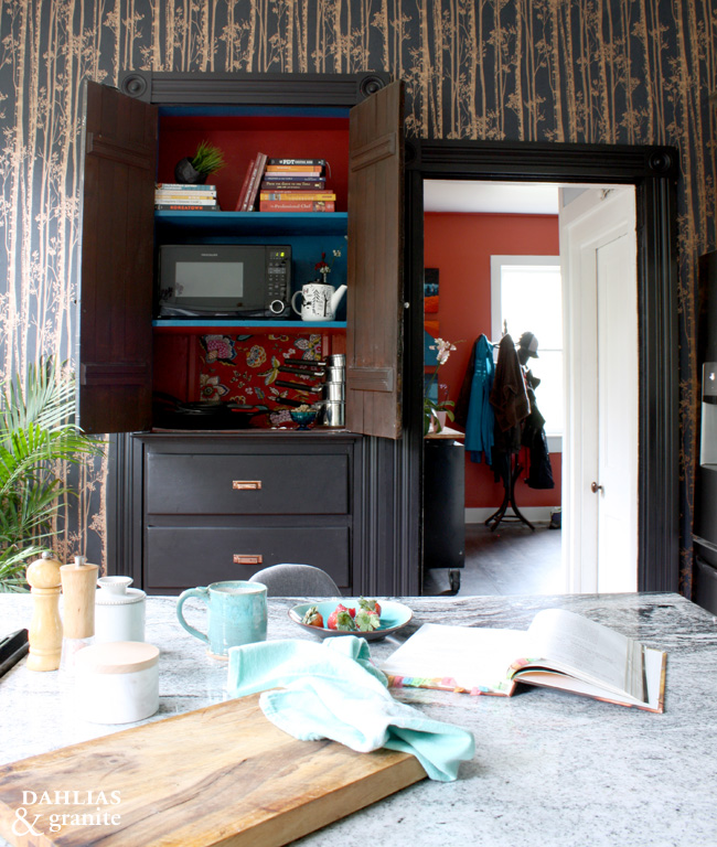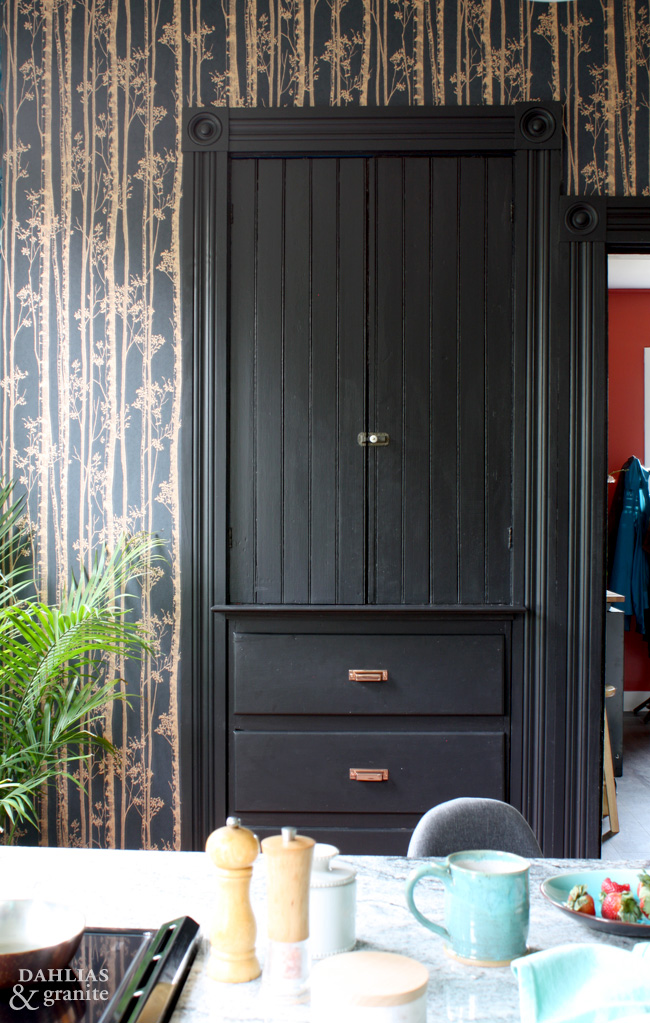 I have added copper pulls to this original built in pantry and the copper on the wallpaper really pulls this wall together.