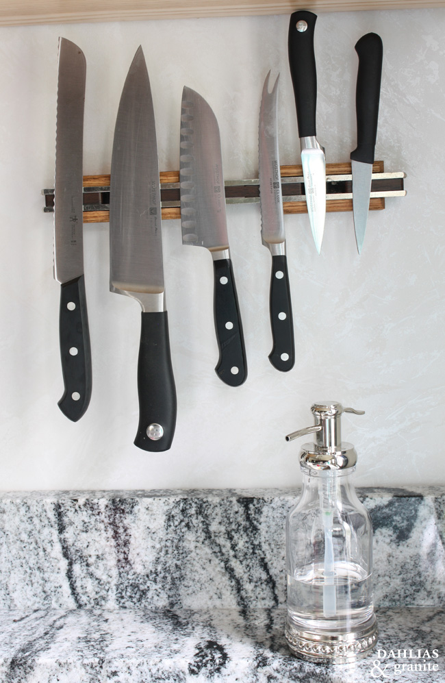 I use hooks with magnets to store our oven mitts and this great little pan scraper, that also works on the range top. Tools that have more than one function are amazing!