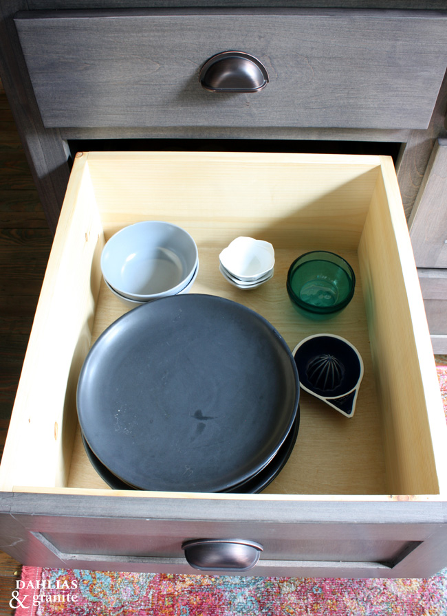 This is one of the deeper drawers where we store our large dinner plates, our tiny food prep or sauce bowls plus a few bowls that don’t match the others!