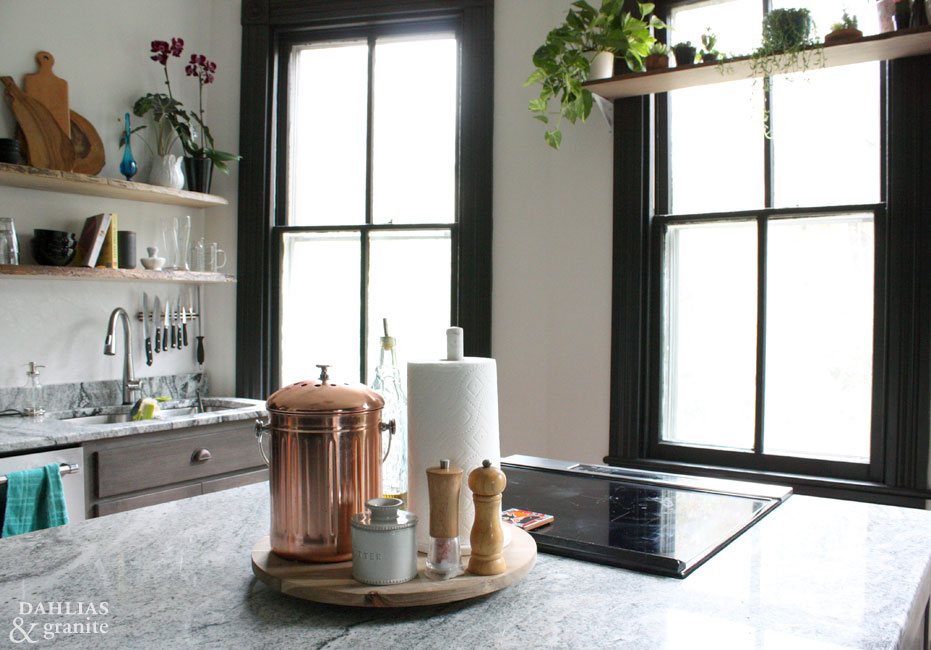 Here is how my counters look today. I used items I really do use everyday to style the shots. The copper compost bin was in front of the acacia wood lazy susan that you see here.