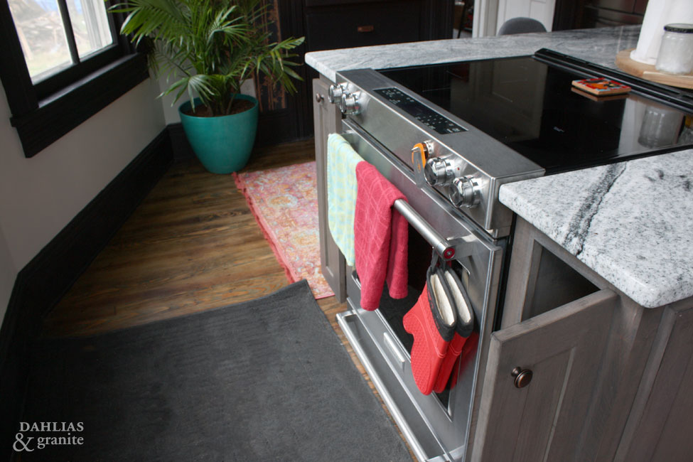 We have three outlets on the island, one on each side (except the range side). I’m very happy with the placement of these. Don’t forget outlets on your island, and place one more than you think you’ll need. I’m going to upgrade the outlets to a colour that blends in more with the grey wood than the stark electrician white!