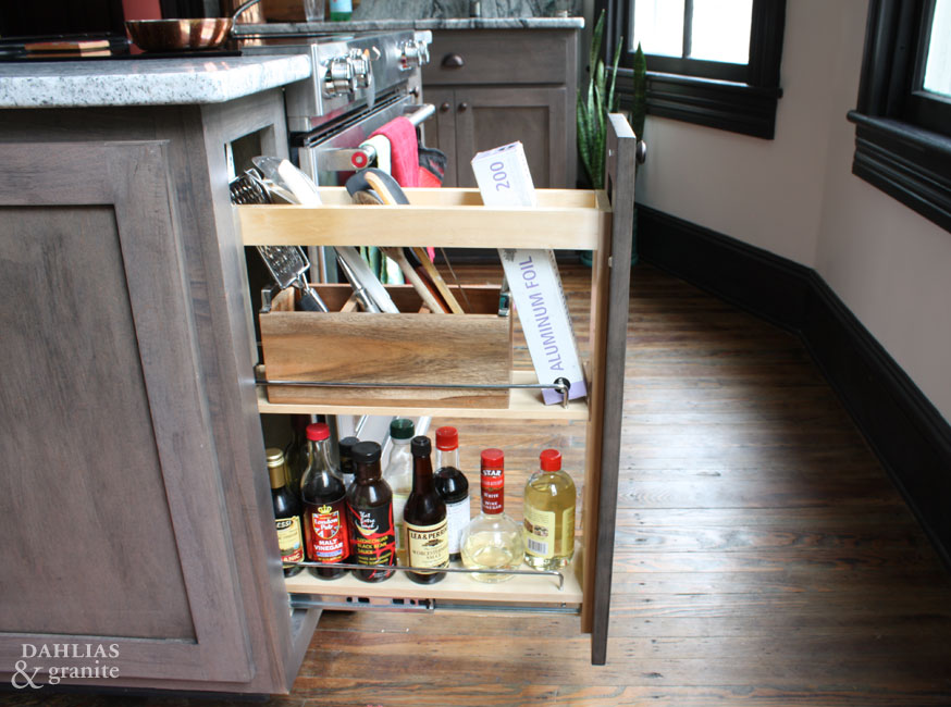 At the front of the island, on either side of the range there are two slim cabinets. The one to the left is a pull out spice drawer, and came with four shelves. I don’t keep my spices in the typical cylindrical jars, so I removed two shelves plus I really wanted to use this pull out to hide all of our spatulas and wooden spoons!