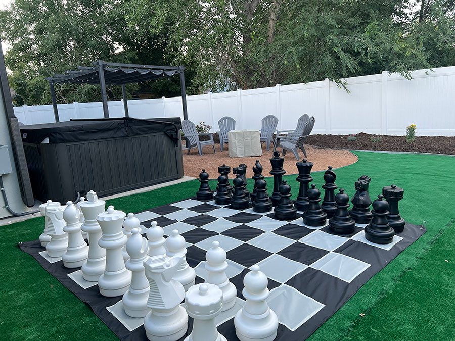 After – A fun play space with chess, hottub, grilling area, undercover seating and undercover dining